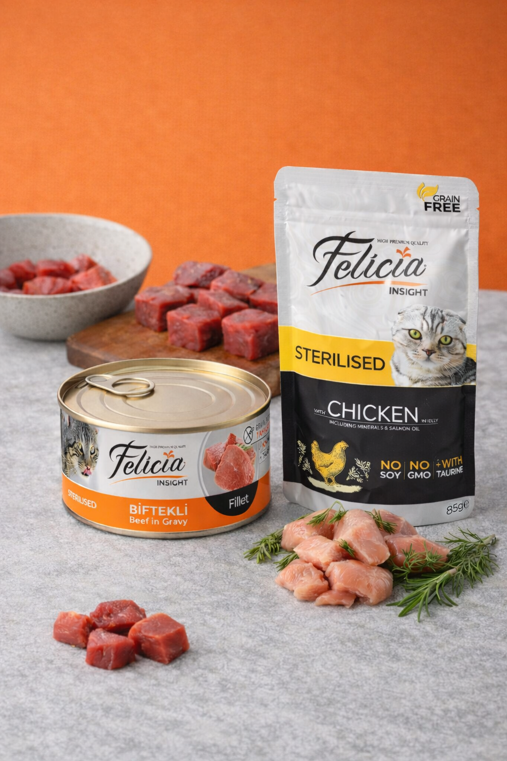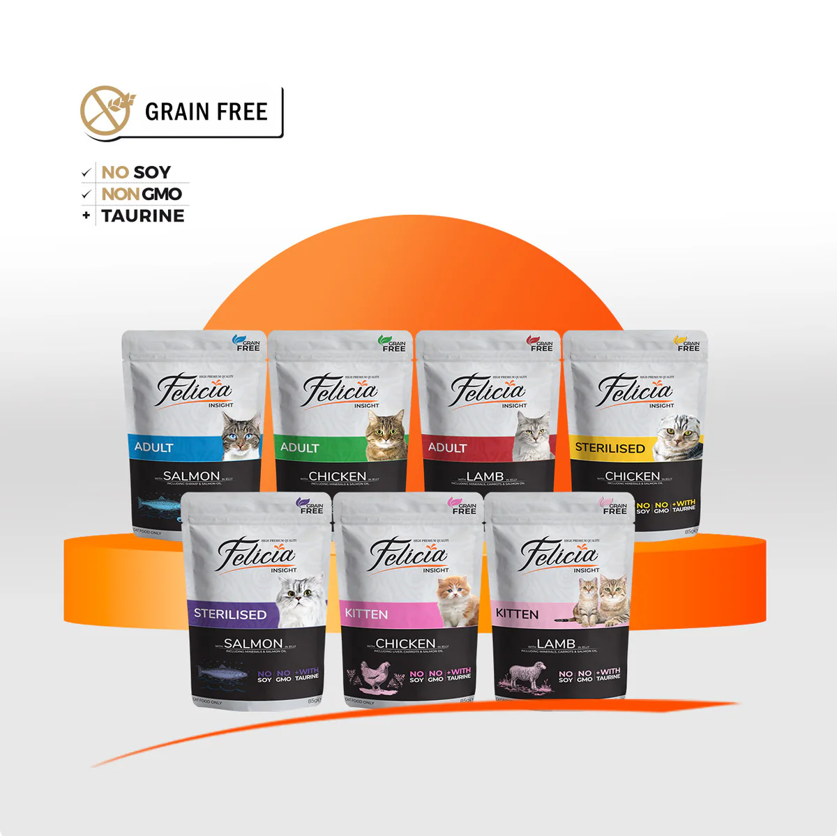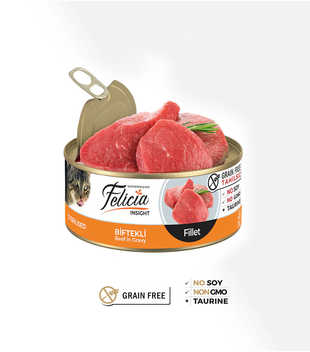Hrana umedă fără cereale Felicia este o serie de hrană umedă preparată cu ingrediente atent selecționate pentru pisici, produsă din materiale fără cereale, soia și OMG-uri. De asemenea, satisfăcând nevoile de taurină ale pisicii dvs., hrana umedă Felicia este produsă în diferite arome de care puii, adulții și pisicile sterilizate nu se vor sătura.