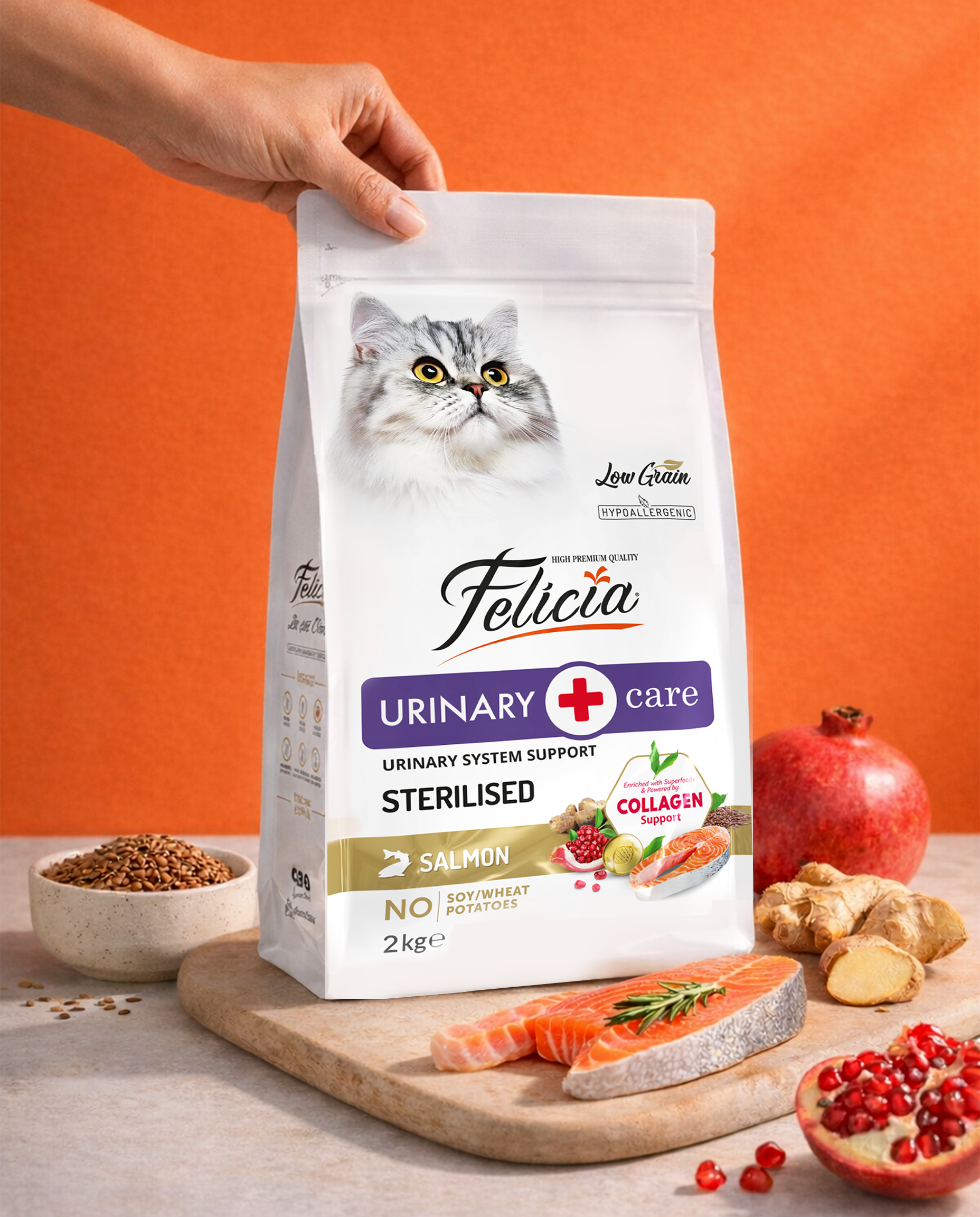 Am pregătit o formulă specială hipoalergenică, cu conținut redus de cereale, împreună cu nutriționiștii noștri, astfel încât prietenii noștri simpatici să se hrănească în conformitate cu condițiile lor naturale de viață și să trăiască mai sănătos. Felicia, care are surse de proteine animale foarte digerabile, a fost special dezvoltată împotriva sensibilităților digestive și alergiilor. Nu conține carne de vită, produse lactate, grâu, soia, cartofi, îndulcitori artificiali, coloranți, arome chimice și OMG-uri asociate cu reacții alergice!