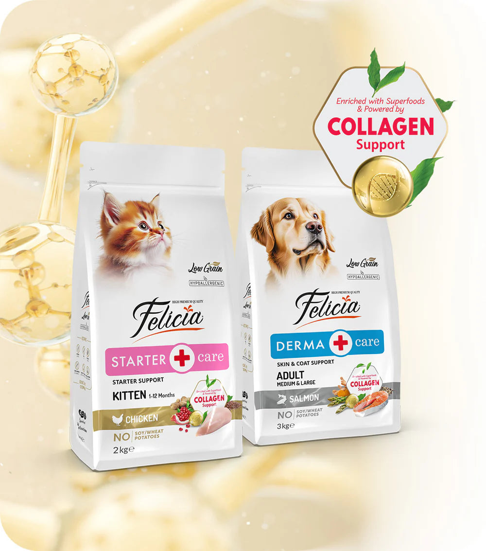 Mult mai mult este acum posibil pentru fericirea și sănătatea pisicilor și câinilor! Felicia duce calitatea vieții prietenilor noștri necuvântători la cel mai înalt nivel cu hrana sa îmbogățită cu colagen, o premieră în România.