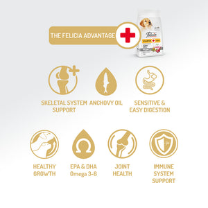 Acizii grași naturali EPA și DHA susțin dezvoltarea inimii, creierului și sistemului nervos. În plus, includerea glucozaminei și condroitinei ajută la menținerea sănătății articulațiilor și susține mobilitatea normală în timpul creșterii. Cu Felicia®, îi oferi cățelușului o nutriție sigură și echilibrată pentru un început puternic și încrezător.