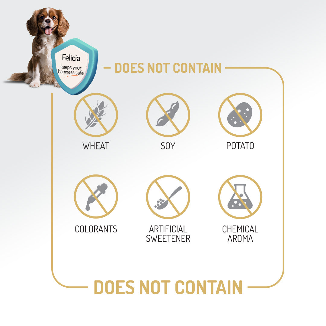 Felicia® Starter Care Câini Junior cu Miel Flexi Size este formulat pentru a se potrivi sistemelor digestive sensibile ale cățelușilor de toate dimensiunile, susținând un început sănătos în viață. Rețeta este săracă în cereale și hipoalergenică. Nu conține carne de vită, produse lactate, grâu, soia, cartofi, arome artificiale, coloranți, aditivi chimici sau organisme modificate genetic (OMG).
