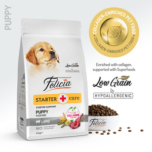 La Felicia®, oferim soluții nutriționale dedicate pentru a susține creșterea și dezvoltarea sănătoasă a cățeilor, de la tranziția de la laptele matern la hrana solidă. Felicia® Starter Care Puppy Lamb Flexi Size oferă un sprijin echilibrat și cuprinzător în această etapă critică a vieții, cu formula sa de generație următoare îmbogățită cu colagen și ingrediente funcționale selectate. Proteinele de înaltă calitate derivate din miel real susțin activ dezvoltarea puternică a mușchilor și oaselor, ajutând totodată la menținerea digestiei sensibile și a sistemului imunitar încă în dezvoltare.