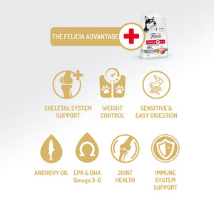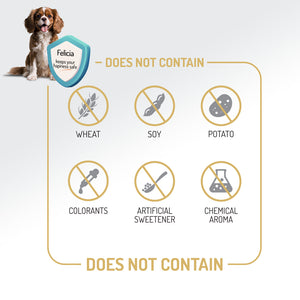 Felicia® oferă o soluție atent formulată, cu conținut scăzut de cereale și hipoalergenică, concepută pentru sensibilitățile și nevoile nutriționale ale câinilor de rasă medie și mare. Rețeta nu conține carne de vită, produse lactate, grâu, soia, cartofi, arome artificiale, coloranți, aditivi chimici sau OMG-uri.