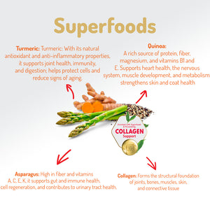 Colagenul hidrolizat ajută la susținerea sănătății articulațiilor și oaselor la câinii de rasă mare, contribuie la elasticitatea pielii și susține o blană sănătoasă și lucioasă. Colagenul oferă, de asemenea, suport multidirecțional pentru sistemele digestiv și imunitar.