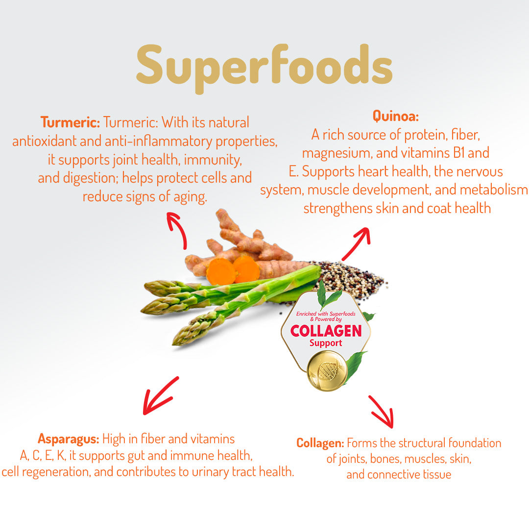 Quinoa: O sursă completă de proteine care susține dezvoltarea mușchilor și nivelurile de energie. Structura sa fără gluten susține digestia ușoară și absorbția nutrienților. Datorită conținutului ridicat de fibre, quinoa ajută la susținerea sănătății digestive și contribuie cu minerale esențiale precum magneziu, fier, fosfor și zinc, împreună cu vitaminele B și E. Proprietățile sale antioxidante ajută la protejarea celulelor, susținând în același timp o piele sănătoasă și o blană lucioasă.