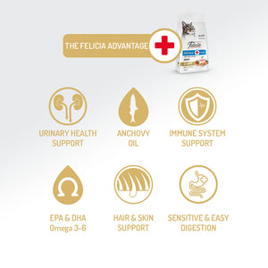 Alimentele Felicia® sunt formulate cu grijă pe baza obiceiurilor alimentare naturale ale pisicilor, oferind digestibilitate ridicată, cu un profil sărac în cereale și hipoalergenic. Formula conține surse de proteine animale de înaltă calitate și nu include carne de vită, produse lactate, grâu, soia, cartofi, arome artificiale, coloranți, arome chimice sau OMG-uri. Fructele de merișoare și conținutul mineral echilibrat ajută la susținerea sănătății tractului urinar și a rinichilor, în timp ce acizii grași Omega 3 și 6 contribuie la o piele sănătoasă și la o blană moale și lucioasă. Cu Felicia®, oferi nu doar alimente, ci și nutriție bazată științific care respectă nevoile alimentare naturale.