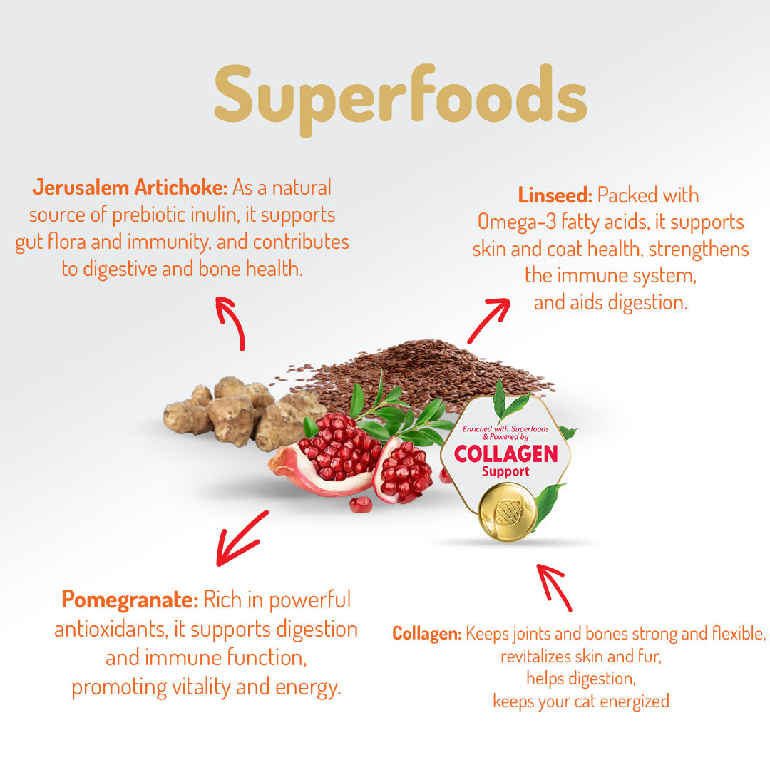 La Felicia, aducem o perspectivă inovatoare asupra sănătății companionilor noștri. Prin pionierii hranei pentru animale susținute cu colagen în Turcia, ne propunem să îmbunătățim calitatea vieții pisicii tale la cel mai înalt nivel. Colagenul, elementul structural natural al corpului, joacă un rol critic în sănătatea articulațiilor, oaselor, mușchilor, pielii și țesuturilor conjunctive, mai ales pe măsură ce producția sa naturală scade în timp din cauza îmbătrânirii, activității intensive sau a nevoilor specifice rasei. Colagenul hidrolizat folosit la Felicia este ușor de digerat și absorbit rapid, susținând sănătatea articulațiilor și oaselor, întărind mușchii și țesuturile conjunctive, îmbunătățind elasticitatea pielii și strălucirea blănii, ajutând la protejarea sistemului imunitar și digestiv pentru o viață mai activă, energică și fericită. Acest suport multidimensional este îmbogățit și mai mult cu taurină, acizi grași omega și superalimente puternice precum semințele de in, anghinarea de Ierusalim și rodia, asigurând libertatea de mișcare, vitalitatea și bunăstarea generală.