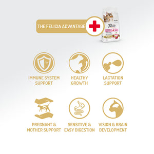 Nivelurile minerale echilibrate susțin dezvoltarea sănătoasă a oaselor și dentare atât la pisicile mame, cât și la pisoi, în timp ce acizii grași Omega 3 și 6 ajută la menținerea sănătății pielii și contribuie la blana mătăsoasă, vibrantă și lucioasă. Cu Felicia®, oferă mamei și pisicuțelor un început sigur, hrănitor și superioară.